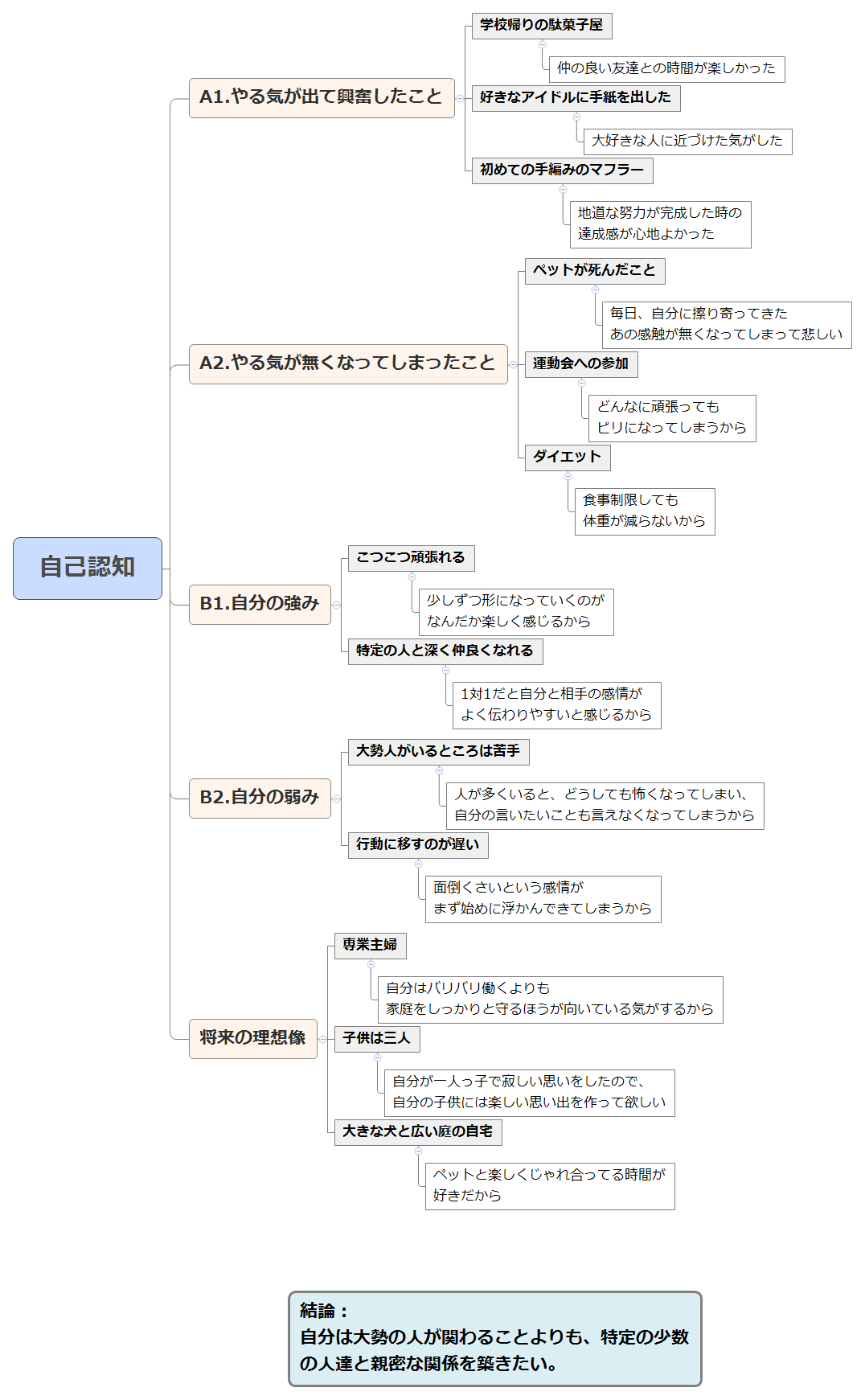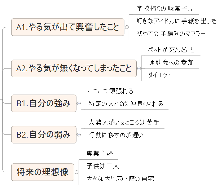 自分自身の過去を振り返って、「A1.やる気が出て興奮したこと」、「A2.逆にやる気が無くなってしまったこと」、「B1.自分の強み」、「B2.自分の弱み」、「C.将来の理想像」などを全て書き出していって下さい。